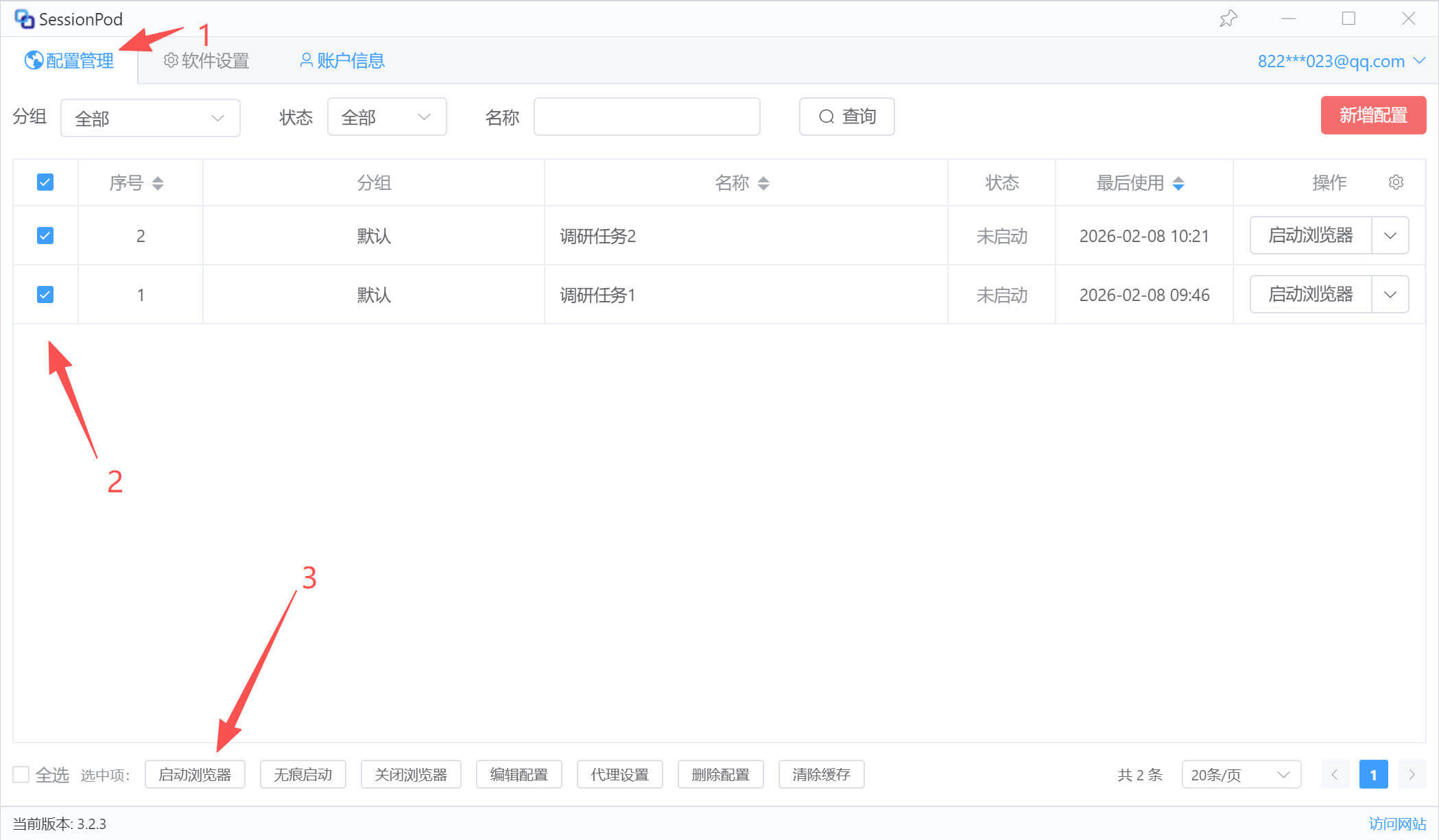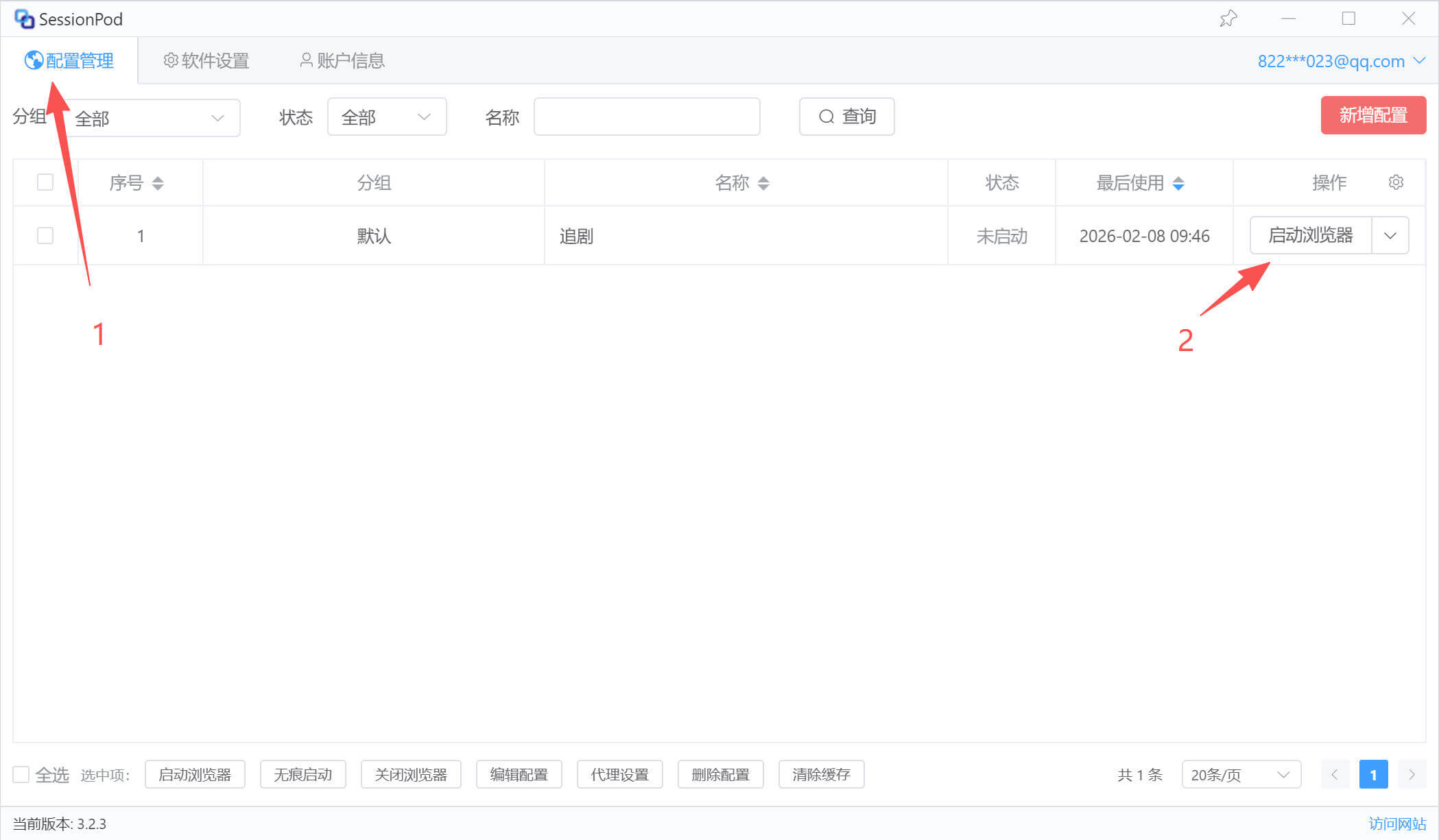 选中要启动的配置,点击底部的“启动浏览器”按钮,如下图: